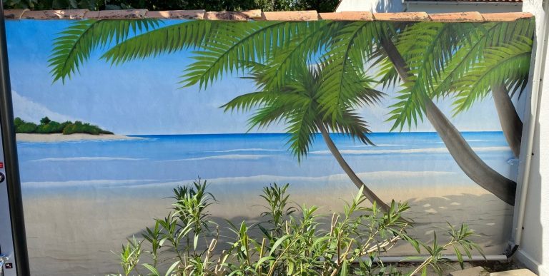 Fresque murale en trompe oeil sur mur extérieur au décor bord mer exotique. Réalisation à Challans en Vendée.