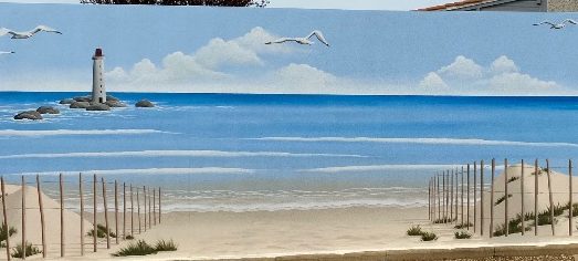 Peinture en trompe oeil décor plage avec chemin de ganivelles, phare et bateau. Réalisation de la fresque à Bretignolles sur mer.